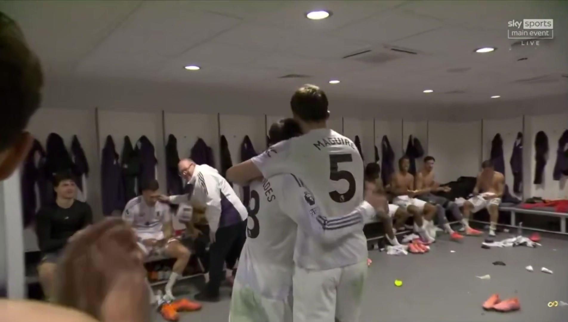 取胜功臣马奎尔接受采访后回到更衣室队友拍头鼓掌欢迎
